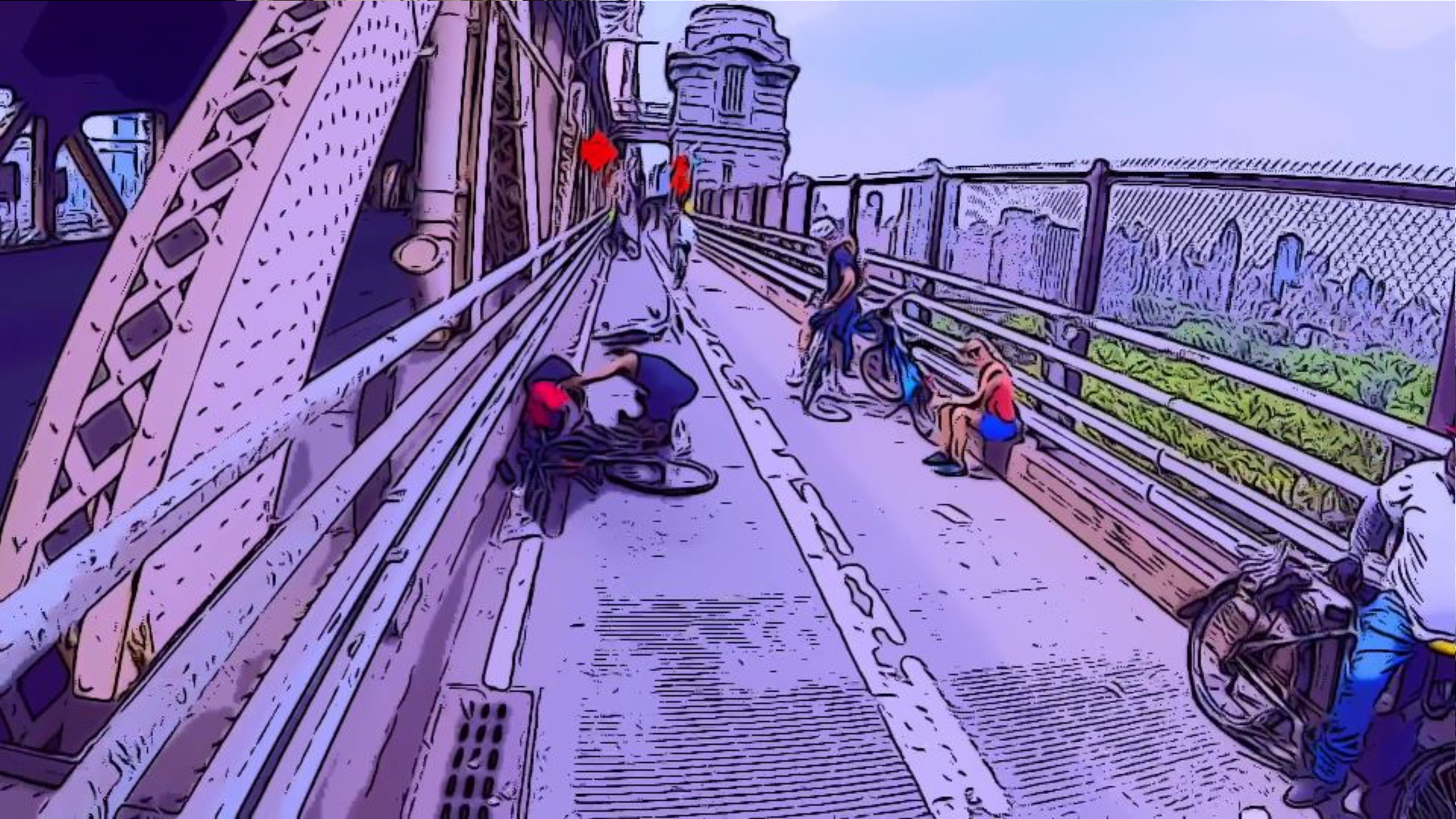 The traffic is light on the bike lanes of the bridge at this time of the hot day.