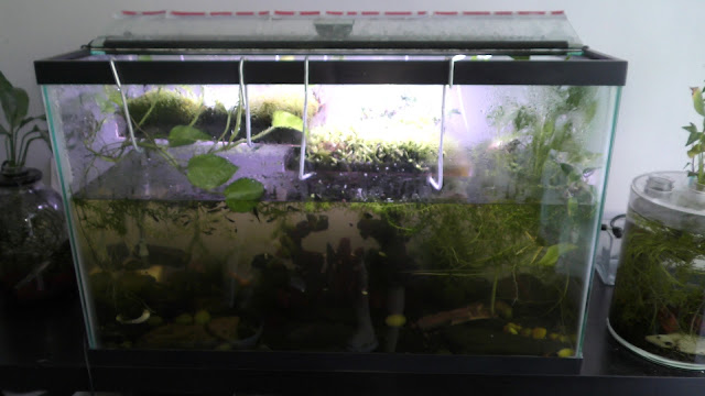 I made platforms for culturing aquatic scuds and terrestrial critters above the water level in this aquarium.