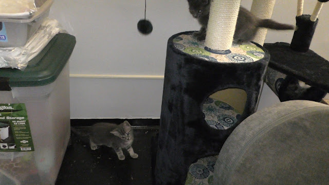 The kittens start figuring out ways to play on the cat tree right away.
